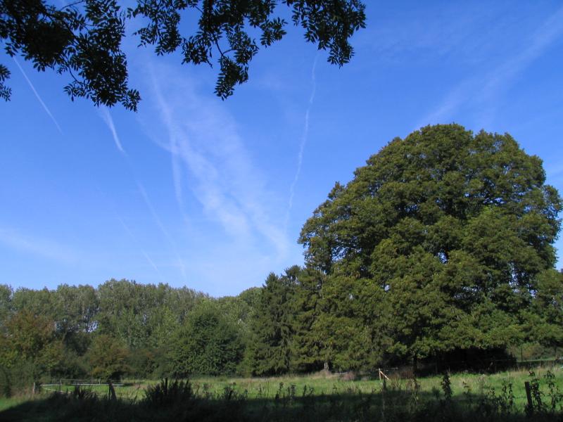Tegenover de oude steengroevegebouwen staat een eeuwenoude lindeboom in een weiland. Volg deze weg en negeer het eerste pad rechts.
