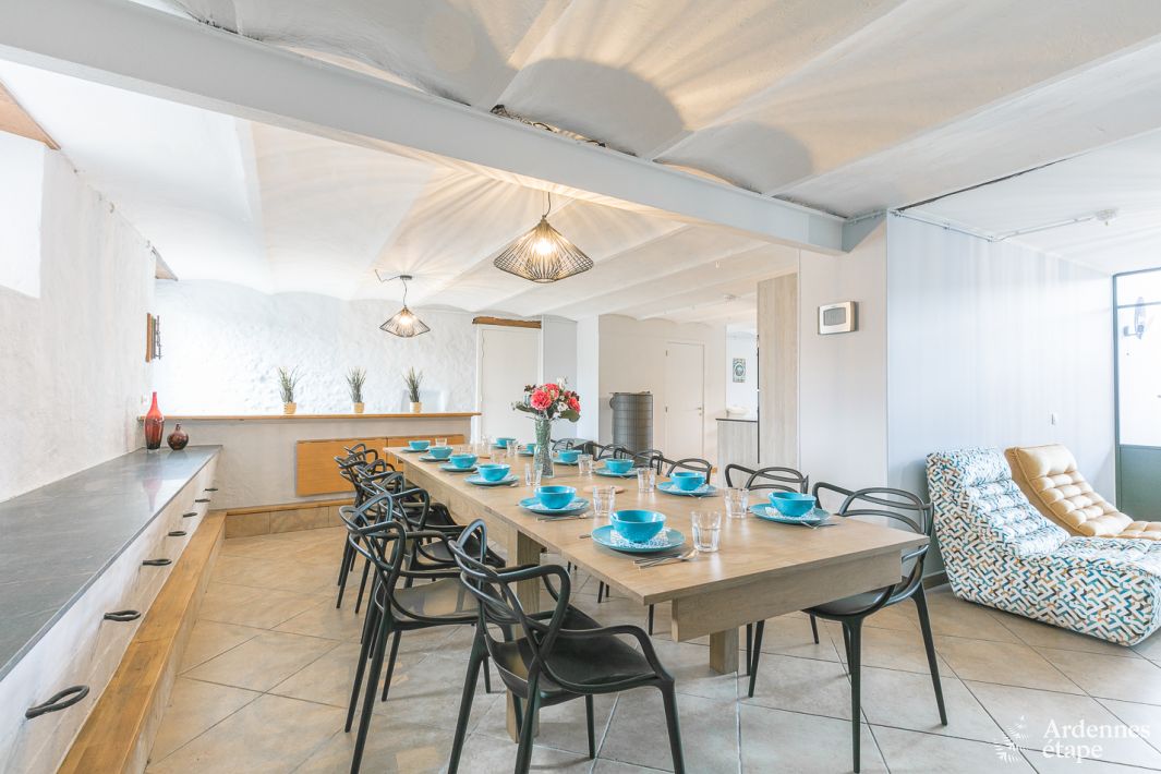 Kom genieten van de rust die eigen is aan een piepklein dorpje in dit charmant vakantiehuis niet ver van de Semois. Waarom jullie hier een ontspannen groepsvakantie zullen beleven? Omdat iedereen hier zijn eigen plek heeft! De 5 ruime slaapkamers – elk met een eigen badkamer – zijn stuk voor stuk sfeervolle coconnetjes. Verder zijn we zeker dat jullie het hier gezellig zullen maken of tijdens een relaxed etentje. Onze tip: tover het ruime tablet achter de eettafel om in een uitgebreid brunch- of kaasbuffet. Lekker makkelijk en altijd feestelijk! Ook buiten in de grote tuin is het altijd genieten. Ben je al klaar om te aperitieven op het zonnige terras?