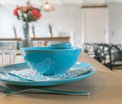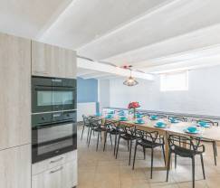 Heel goed gelegen! Voldoende plaats, zeer goed uitgeruste keuken. Zeker voldoende plaats voor 10 mensen. Badkamers kunnen kleine opknapbeurt gebruiken, maar wel ok. Indeling van het huis wel wat minder: keuken beneden, zitkamer met TV tweede verdieping. Klein frigootje daar en ook wat glazen en bordjes daar zou al veel helpen. Nu alles helemaal naar boven voor apero met 10 personen, wel veel.