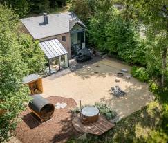Buiten is het genieten geblazen met een houten hottub en een buitensauna, perfect om helemaal tot rust te komen na een dag vol avontuur. Daarnaast is er een barbecue en een vuurkorf waar je ’s avonds samen kunt zitten onder de sterrenhemel. Voor de sportievelingen is er een petanqueveld. Het terras is uitgerust met comfortabel tuinmeubilair, zodat je heerlijk kan ontspannen in de buitenlucht.