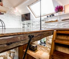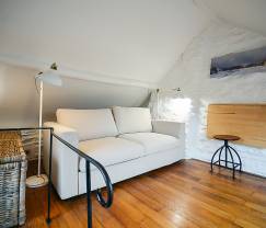 Een trap leidt naar een kleine woonkamer met een slaapbank voor 2 personen. In de avond wordt deze ruimte dus omgevormd tot slaapkamer. Vanuit het gezellige bed, kun je de nachtelijke hemel observeren door het Velux dakraam. En in de vroege ochtend, word je zachtjes gewekt door het gezang van vogels. Met je voeten nog steeds onder de dekens, geniet je van het uitzicht op de tuin en het omliggende platteland.