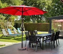 Achteraan het huis bevindt zich een veranda waarin je de zwoele zomeravonden eindeloos kunt rekken. Ongeacht het weer kun je er beschut eten en genieten van de omgeving.