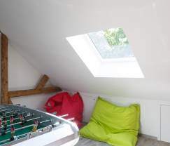 De ruime eetkamer bevindt zich net onder de salon op de mezzanine, waar je ook de voetbaltafel aantreft. De moderne, houten keuken is van alle gemakken voorzien, zoals een 5-pits keramische kookplaat, oven, magnetron, koelkast, diepvries en afwasmachine. In de sfeervolle woonkamer met kabeltelevisie, Dvd-aansluiting en Hifi-installatie is het zeer aangenaam te vertoeven.